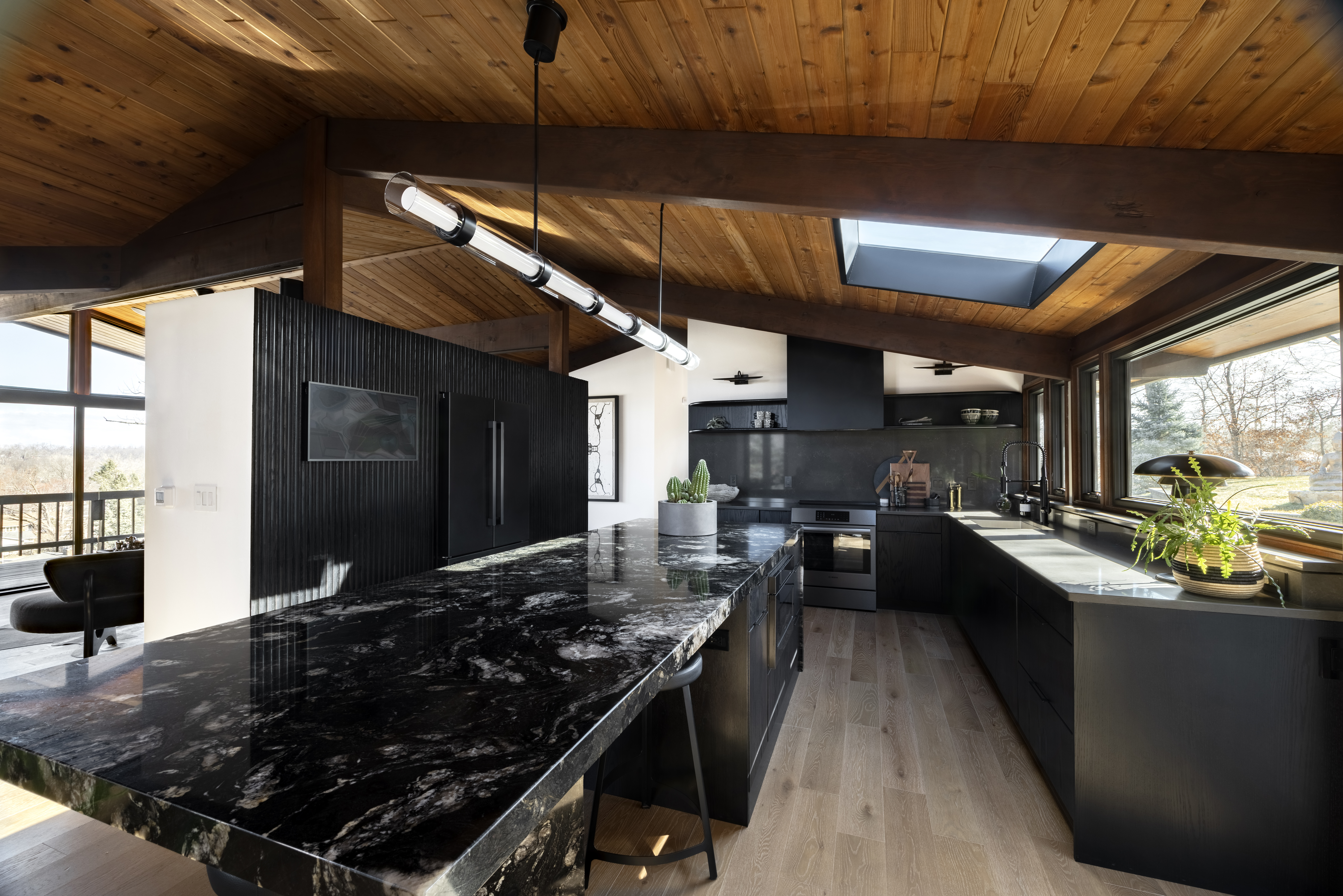 This kitchen renovation combined multiple rooms to create one expansive, open-concept space ideal for entertaining. A 128″ island with seating for six anchors the room, while a hidden pantry keeps the layout sleek and functional. Black oak cabinetry and thoughtfully selected finishes were chosen to complement the home’s original architecture, blending modern luxury with timeless character.